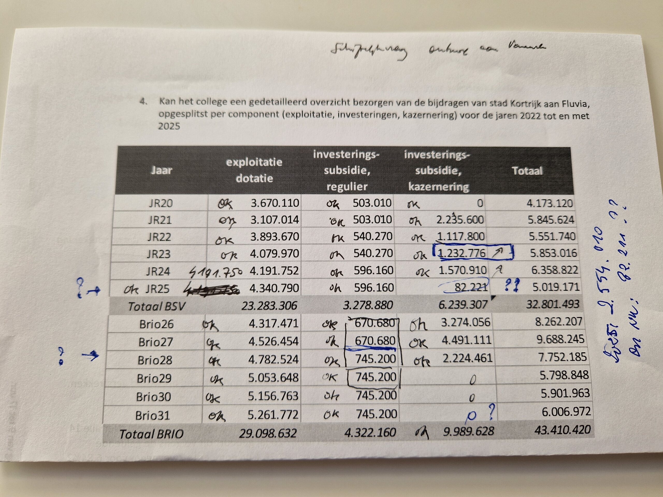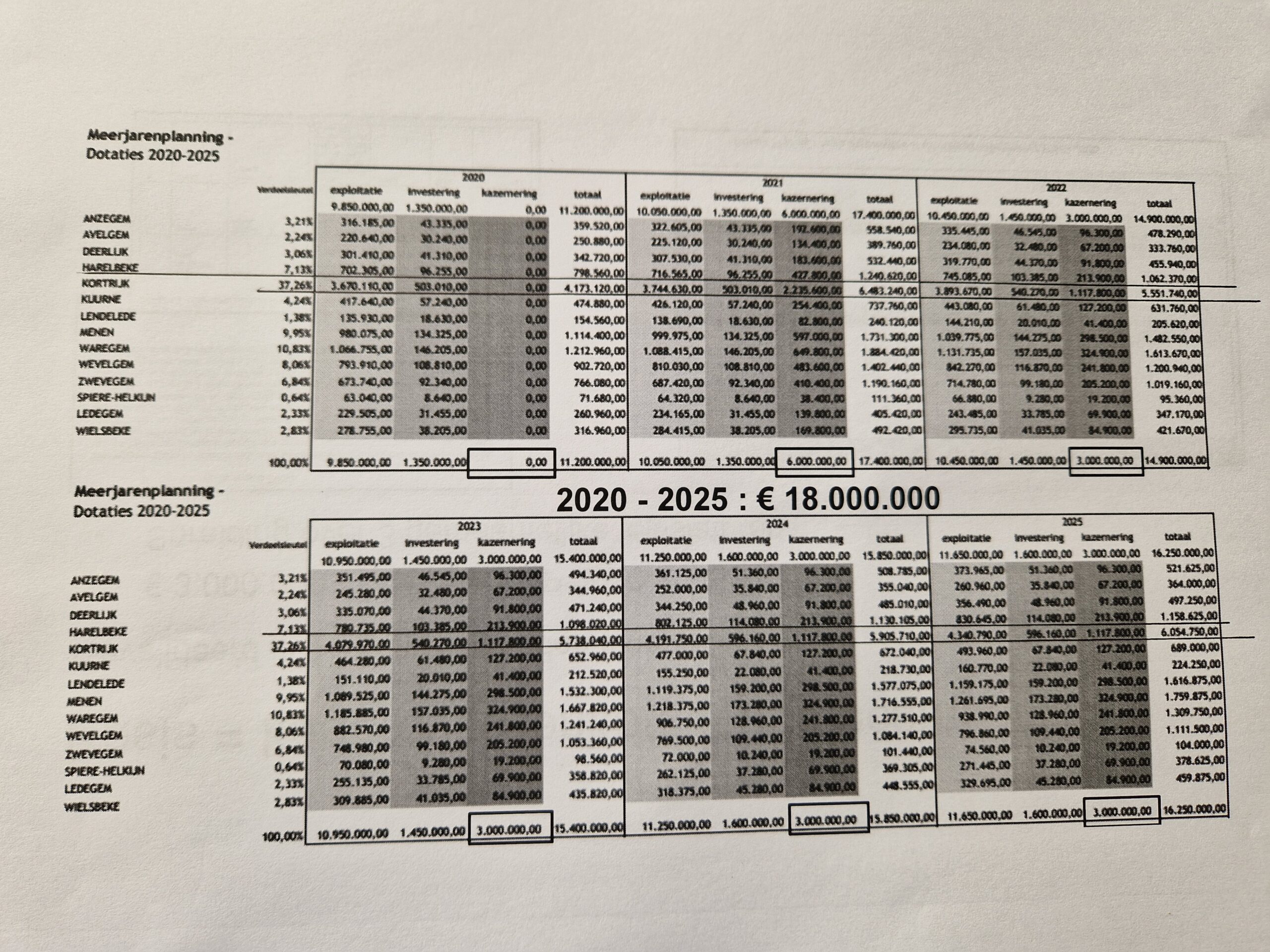 Voor dit jaar 2026 vinden we in het Meerjarenplan 2026-2031 als toelage voor de “kazernering” zelfs twee verschillende bedragen terug als Kortrijkse bijdrage voor het kazerneringsplan: 3.944.736 euro (pag.8) en 3.274.056 euro (pag. 31).